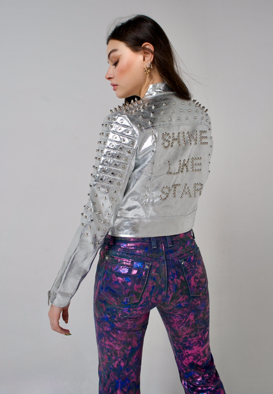 Las prendas fueron creadas en mezclilla intervenida a mano, con pigmentos metálicos en tonos gold, silver y rainbow, logrando un efecto que parece moverse con la luz. Cada pieza fue tratada como una obra de arte: texturas, pinceladas y destellos reflejan la idea de brillar incluso en la sombra.