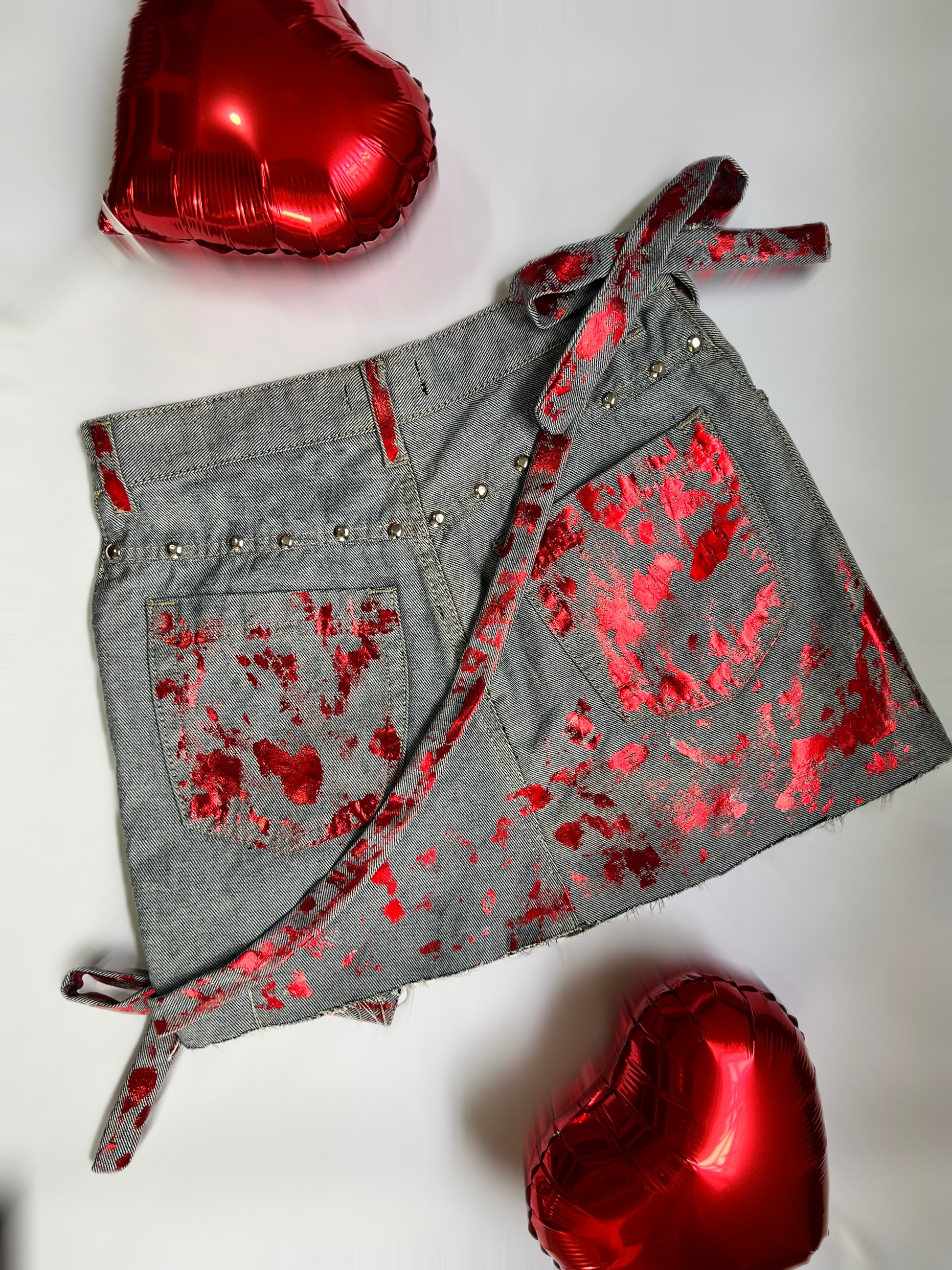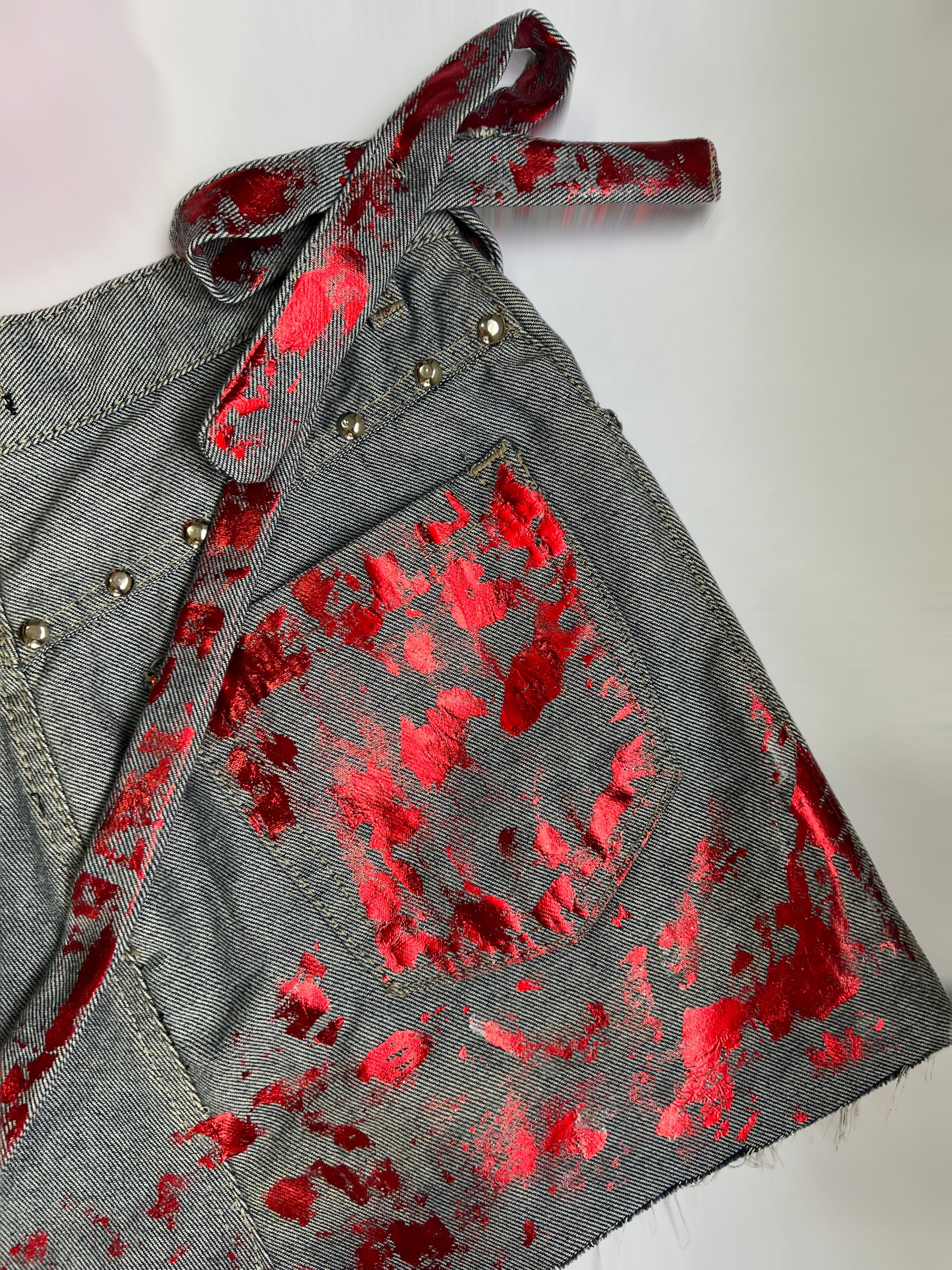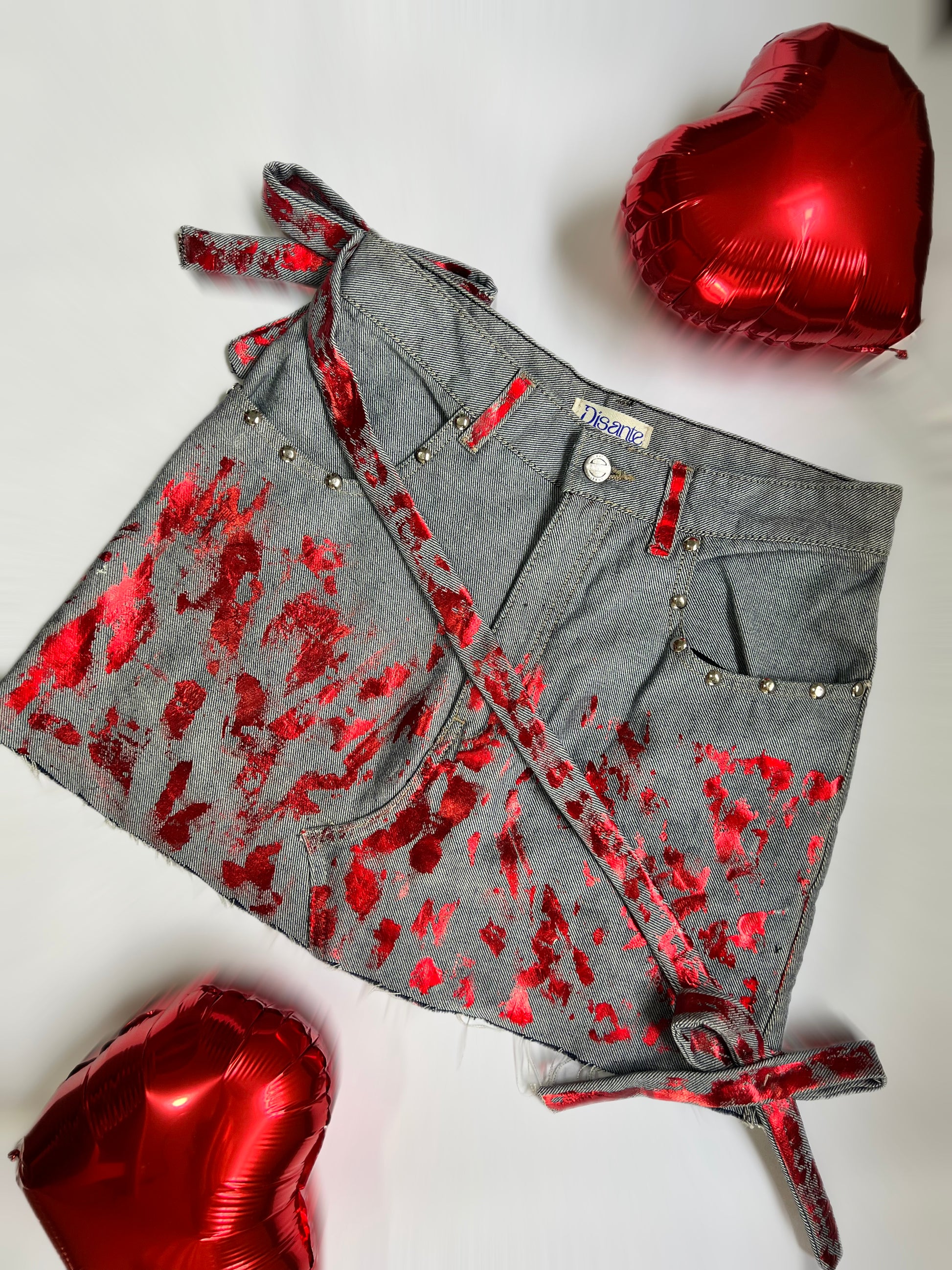FALDA HIGH WAIST DE MEZCLILLA GRIS CON TONOS METÁLICOS ROJOS CON APLICACIONES DE MOÑOS NO AJUSTABLES Y TIRAS PARA SU DECORACÓN (EL PATRÓN DE CADA DISEÑO PUEDE VARIAR DE LA FOTO ORIGINAL)