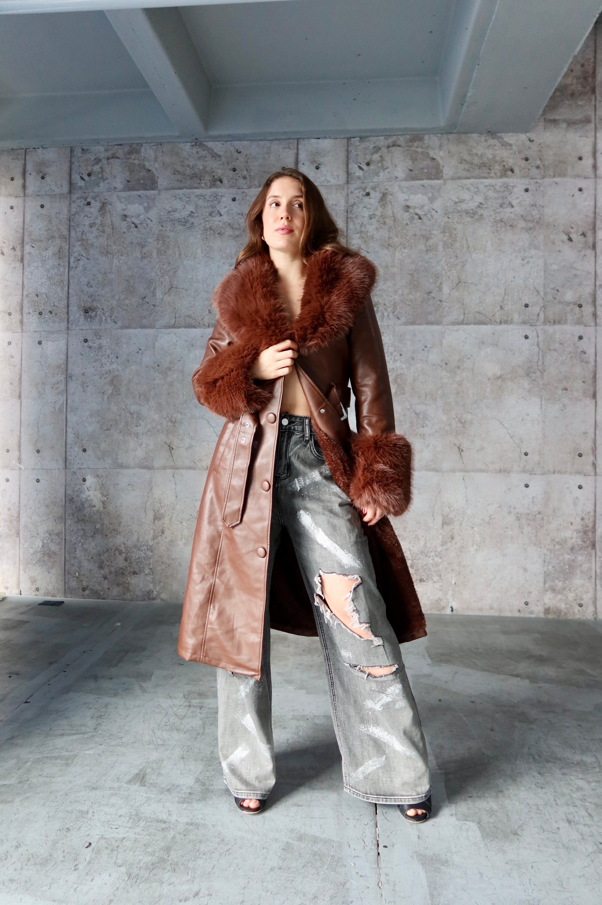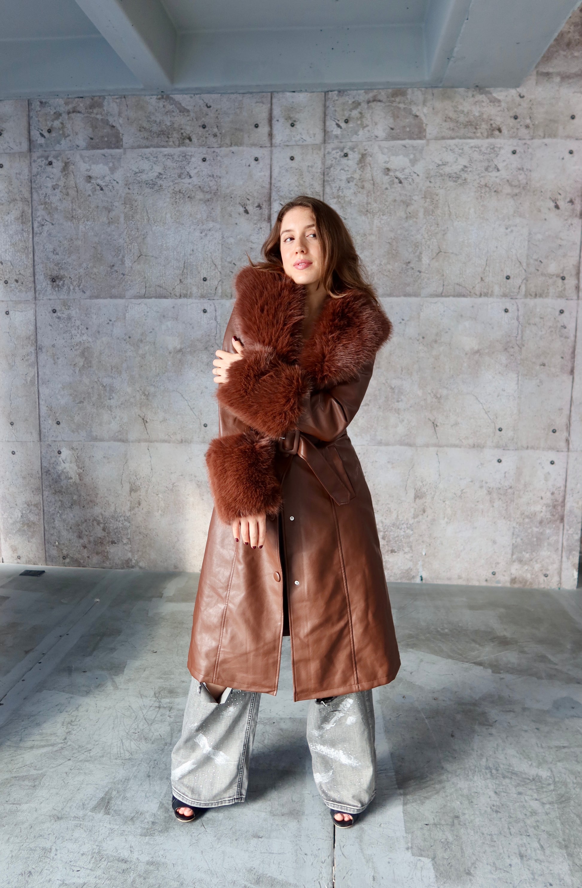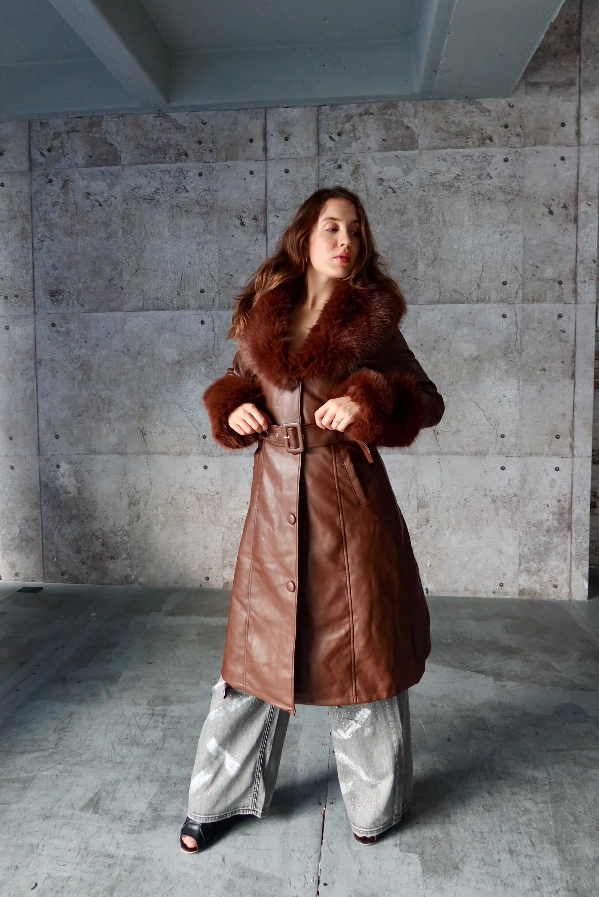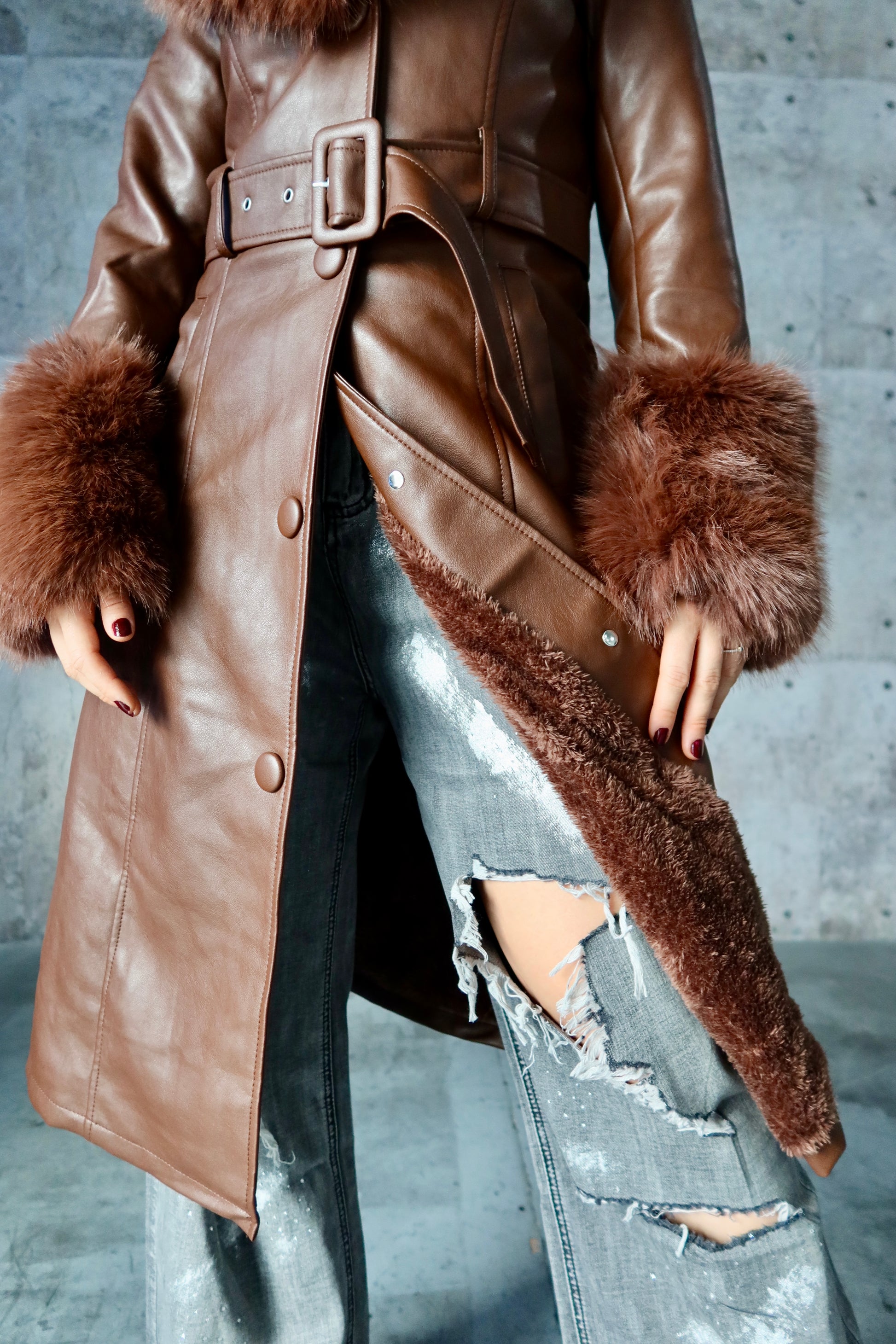 Abrigo de vinipiel color café con peluche sintético en cuello y puños, cinturón cubierto en vinipiel.