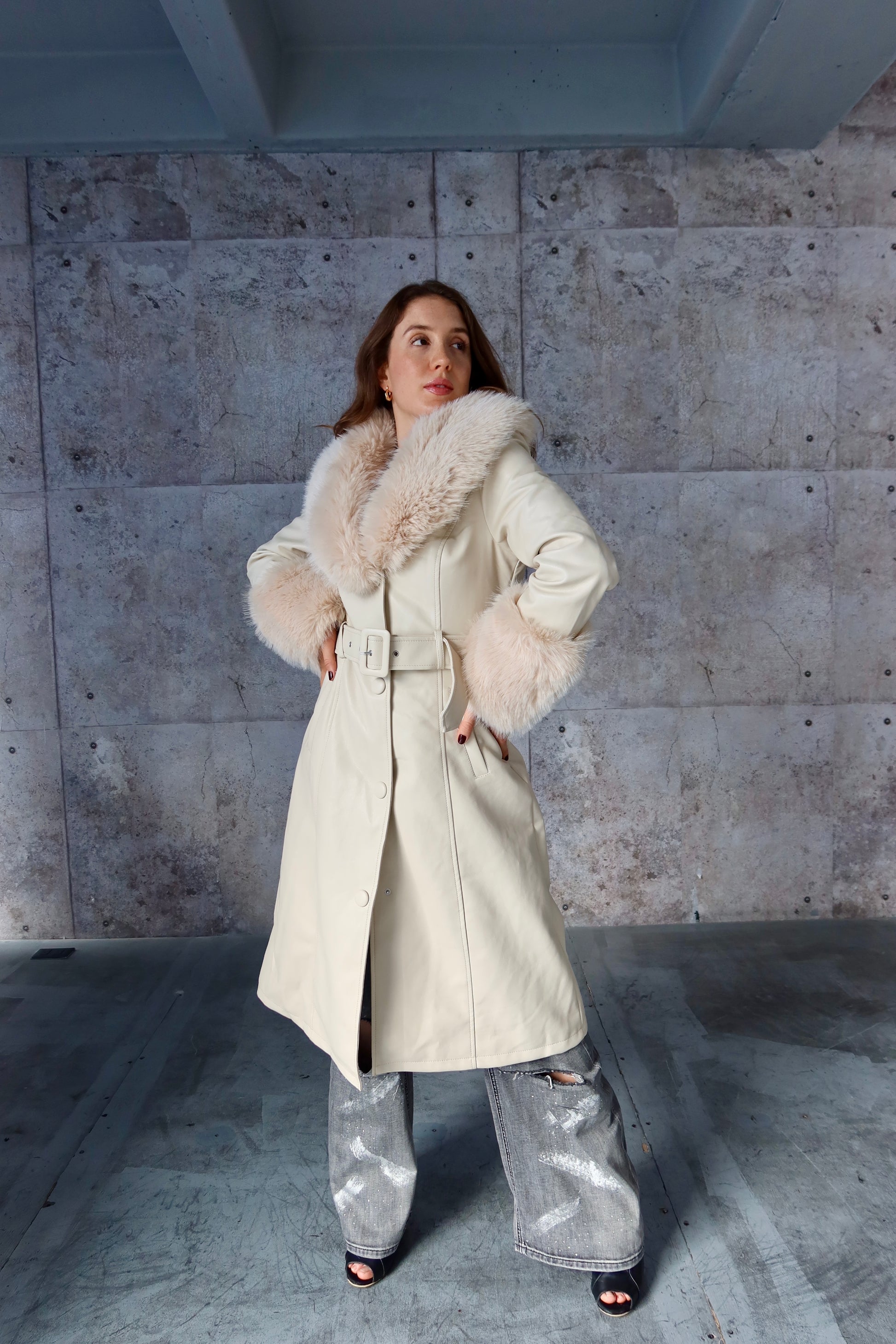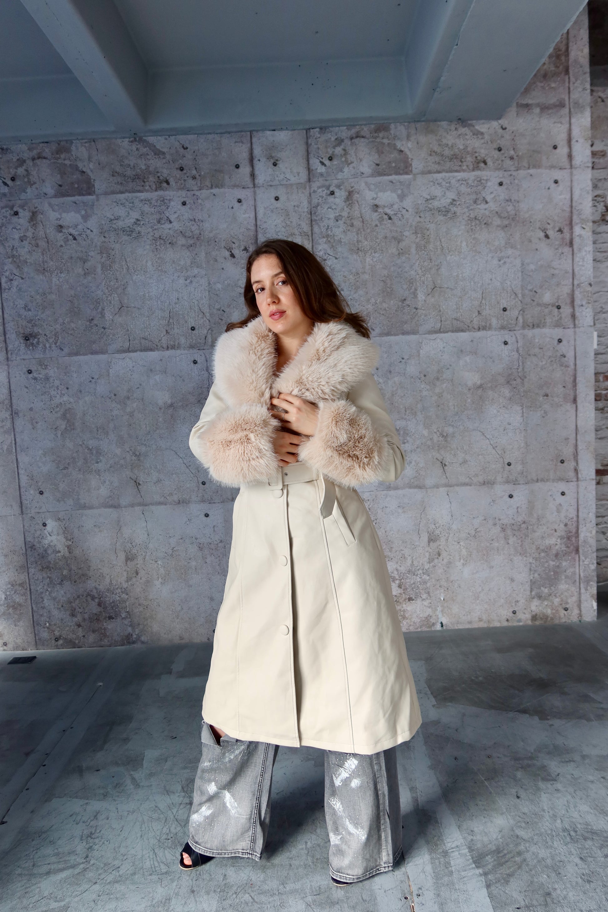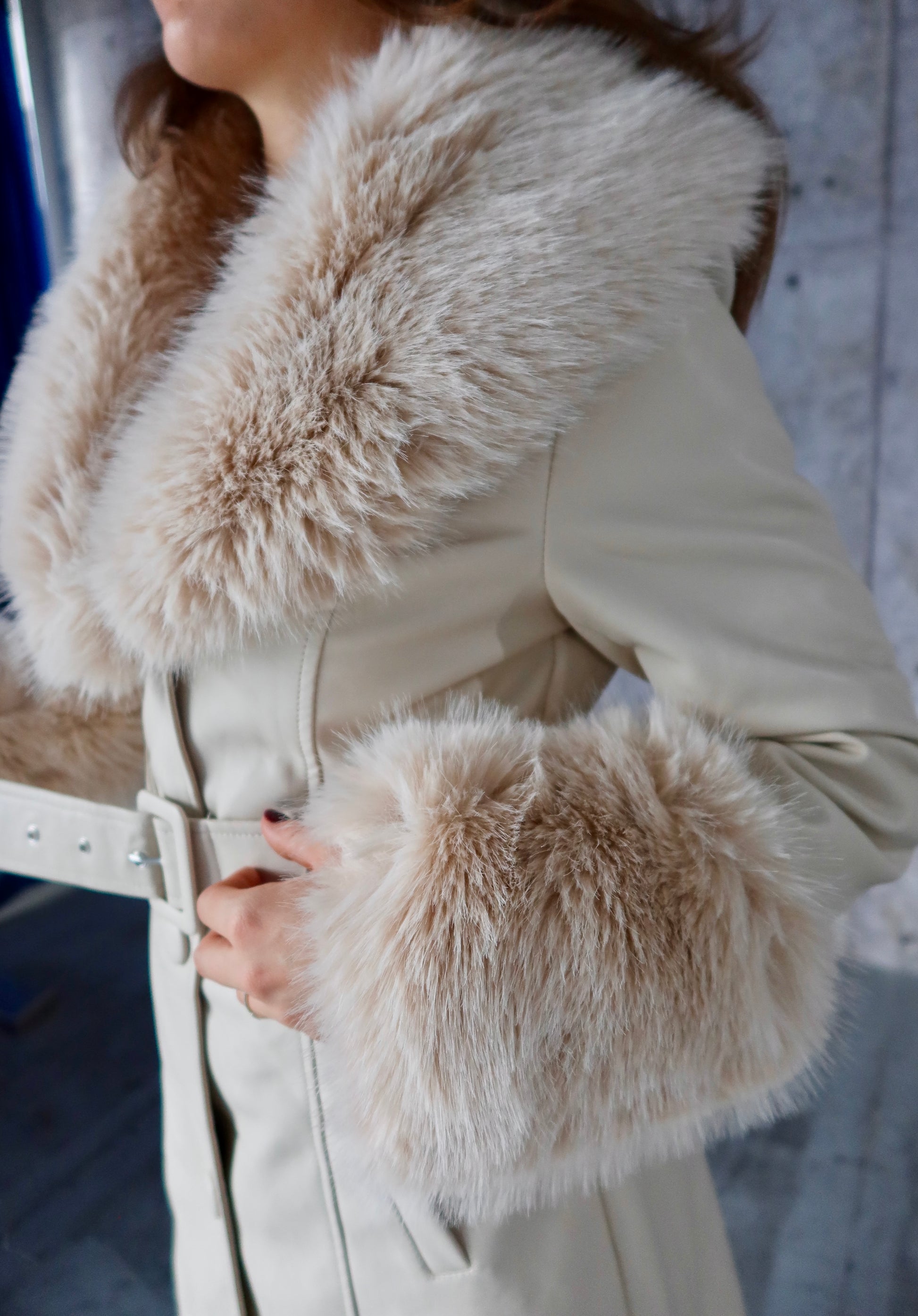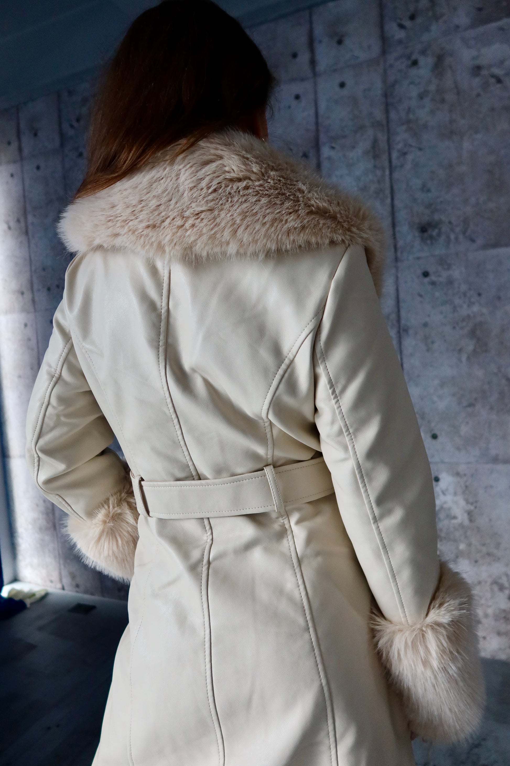 Abrigo de vinipiel color ivory con peluche sintético en cuello y puños, cinturón cubierto en vinipiel.