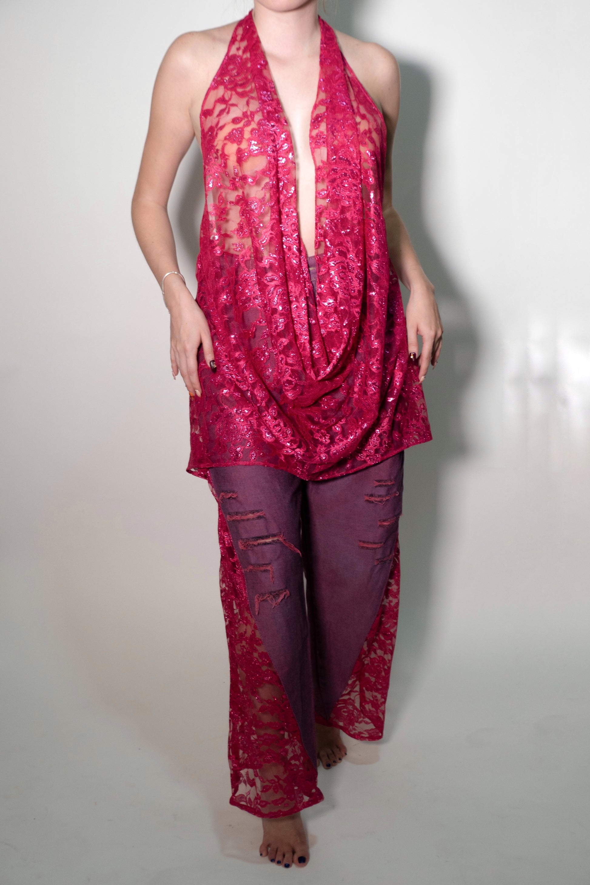 PANTALÓN HIGH WAIST DE MEZCLILLA ROSA CON DETALLES DE ENCAJE ROSA Y APLICACIONES.