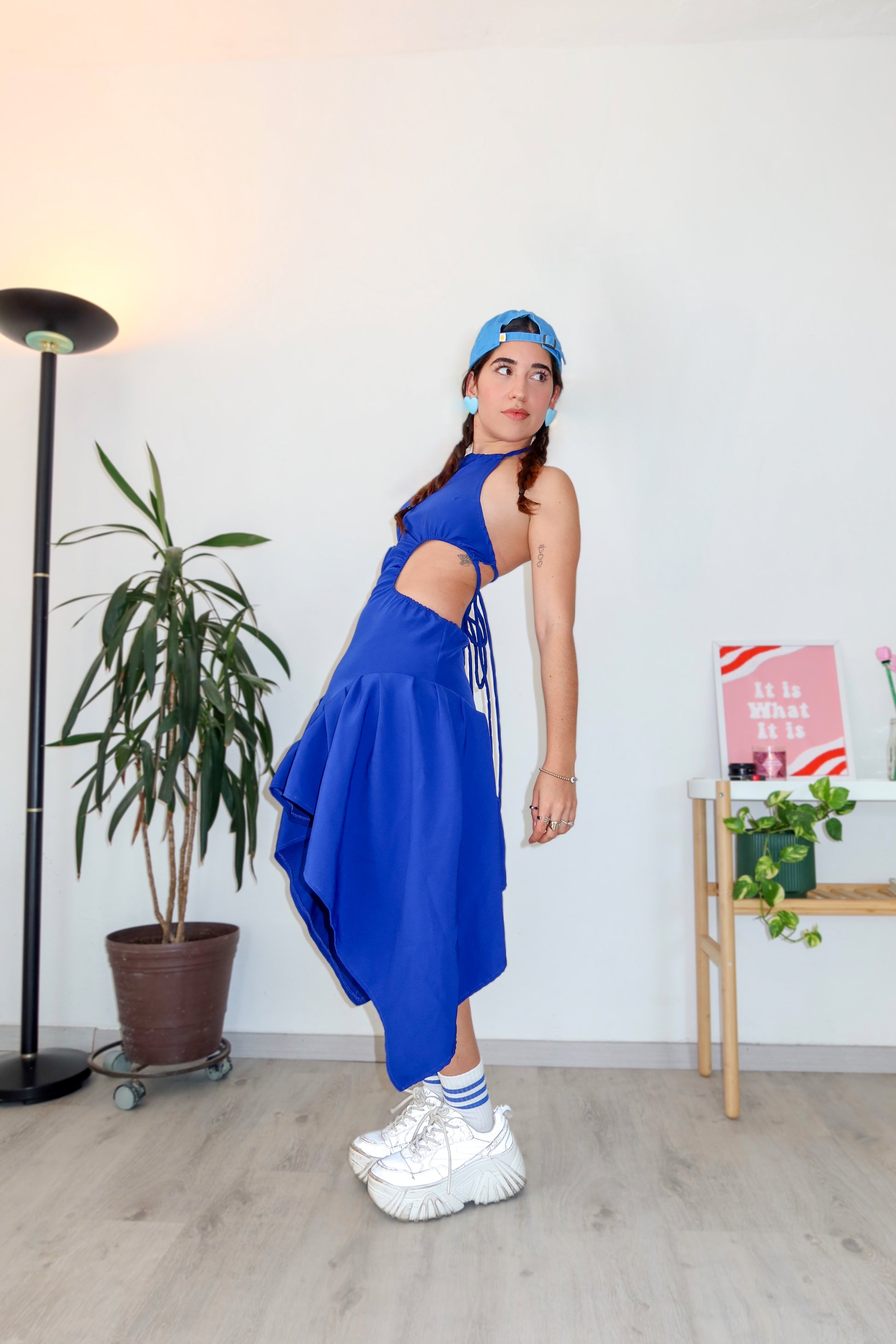Vestido de algodón azul, detalles a los costados en la cintura de elástico.