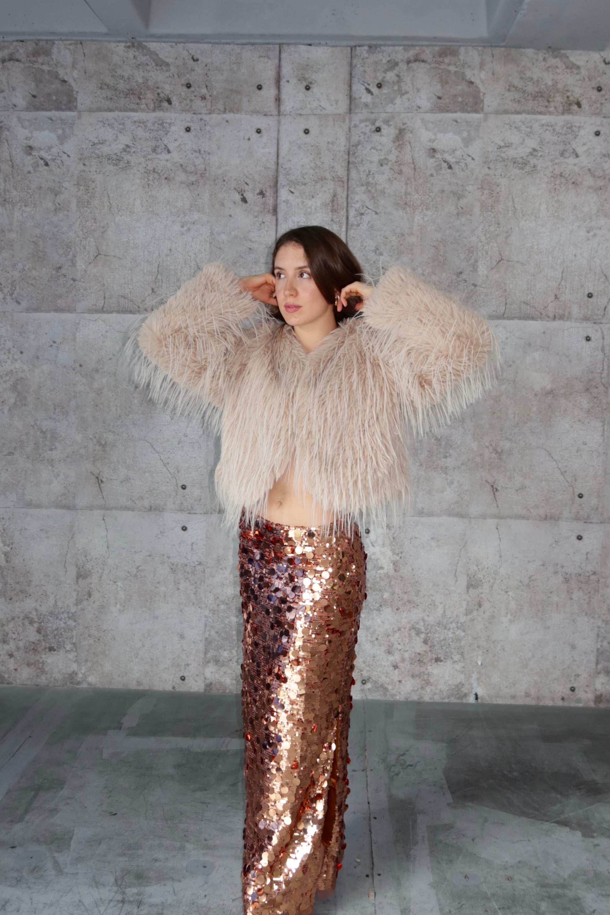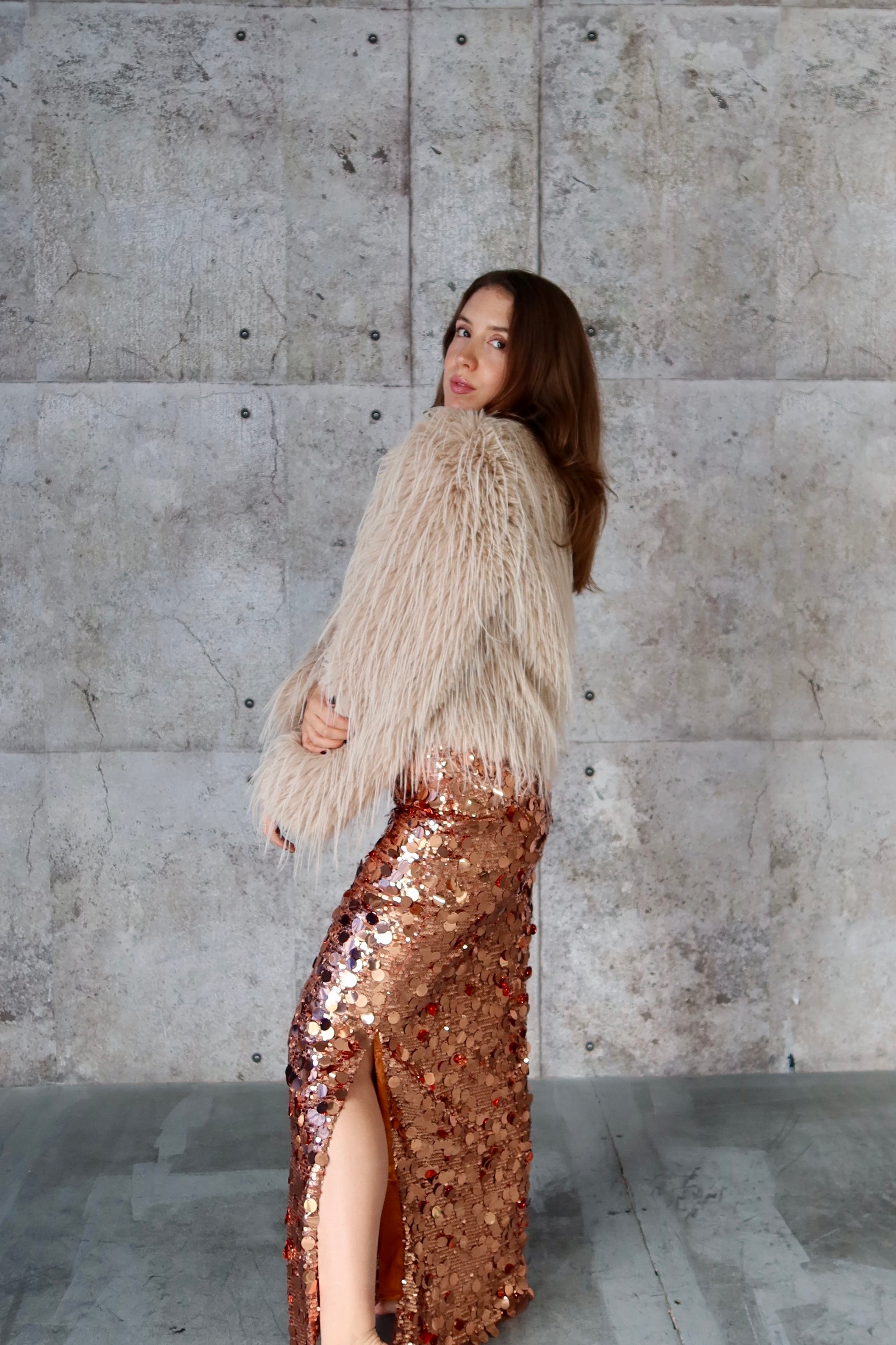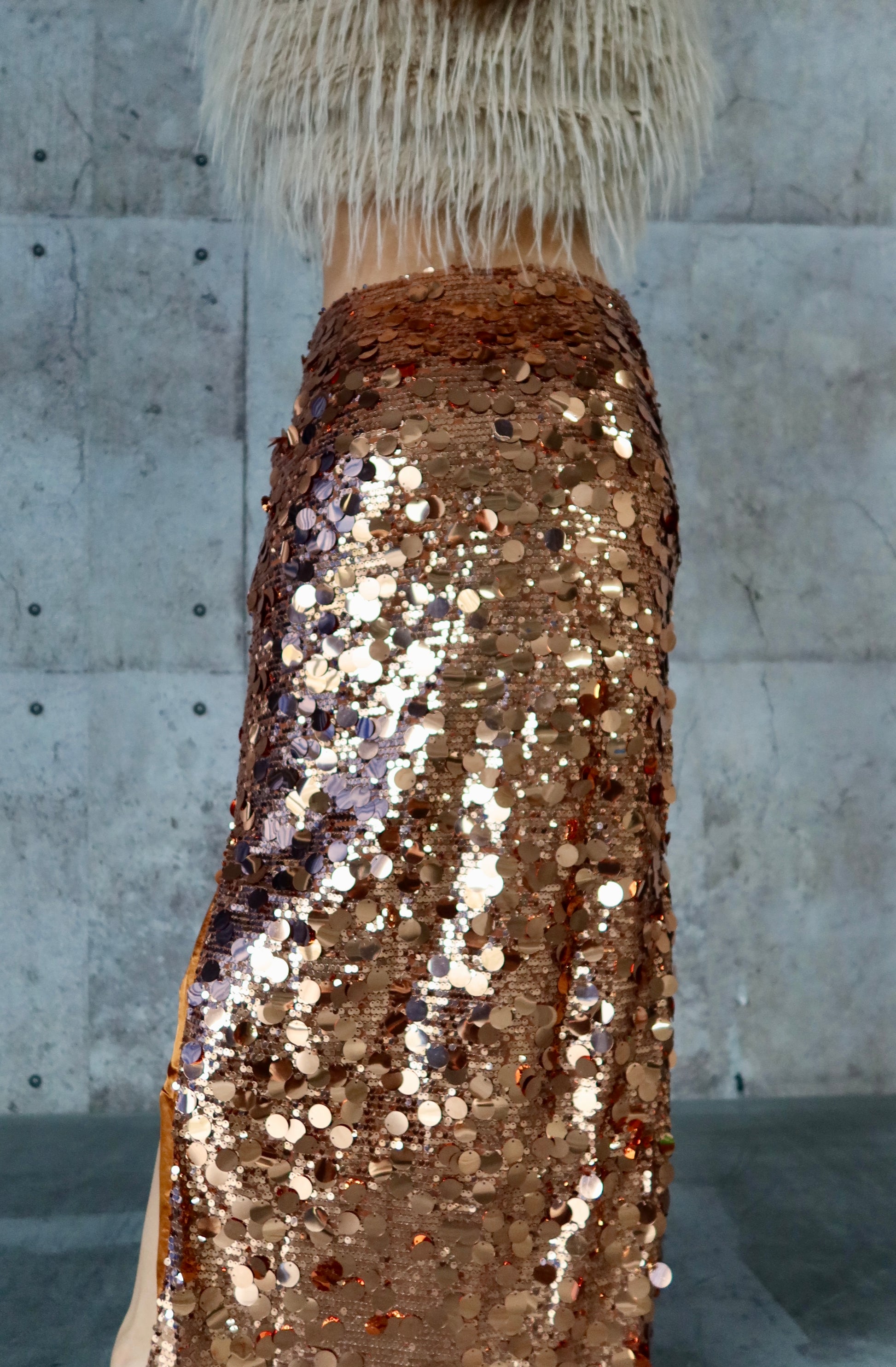 Falda de lentejuela larga (115cm) color cobre con aberturas a los costados.