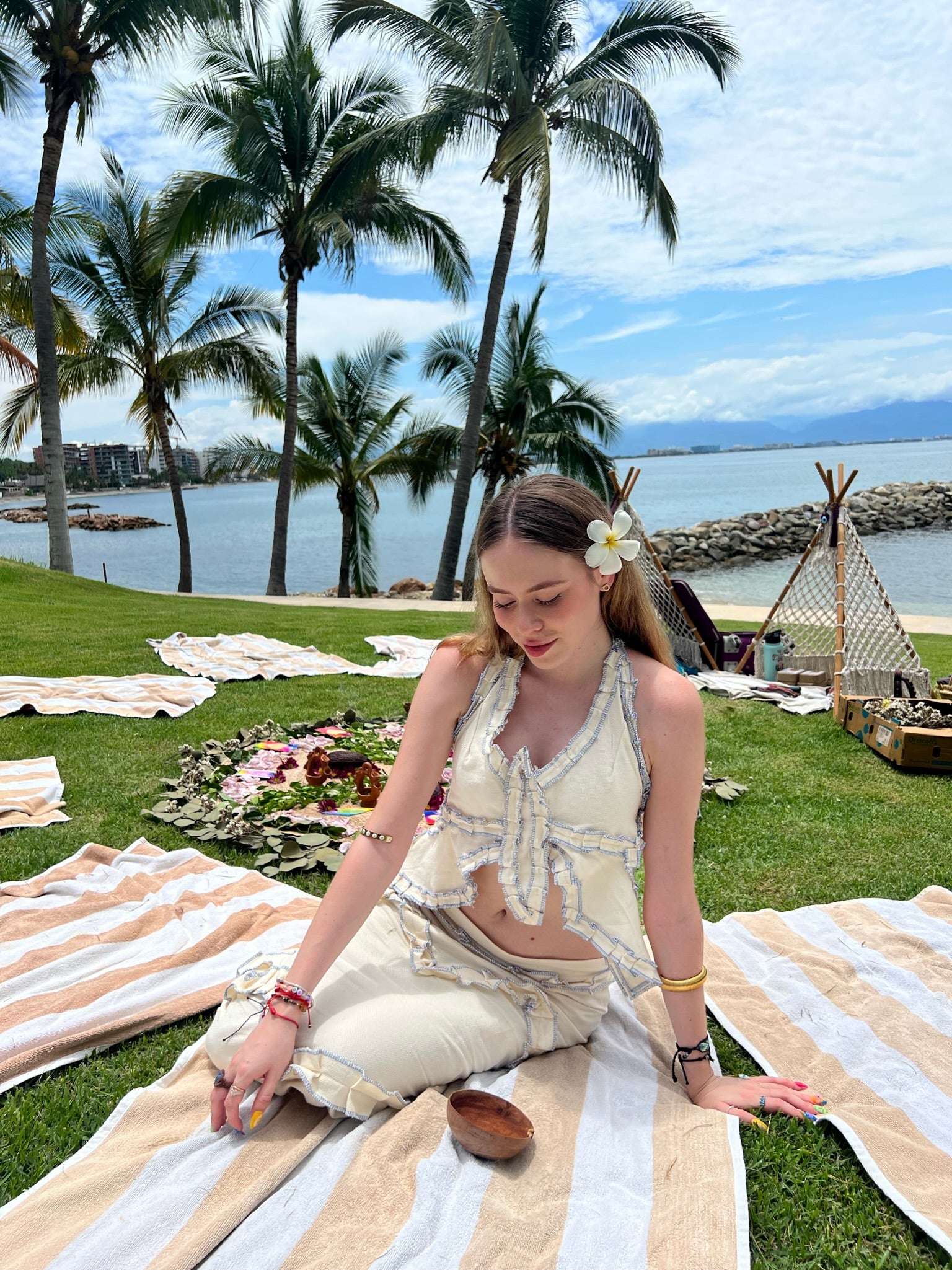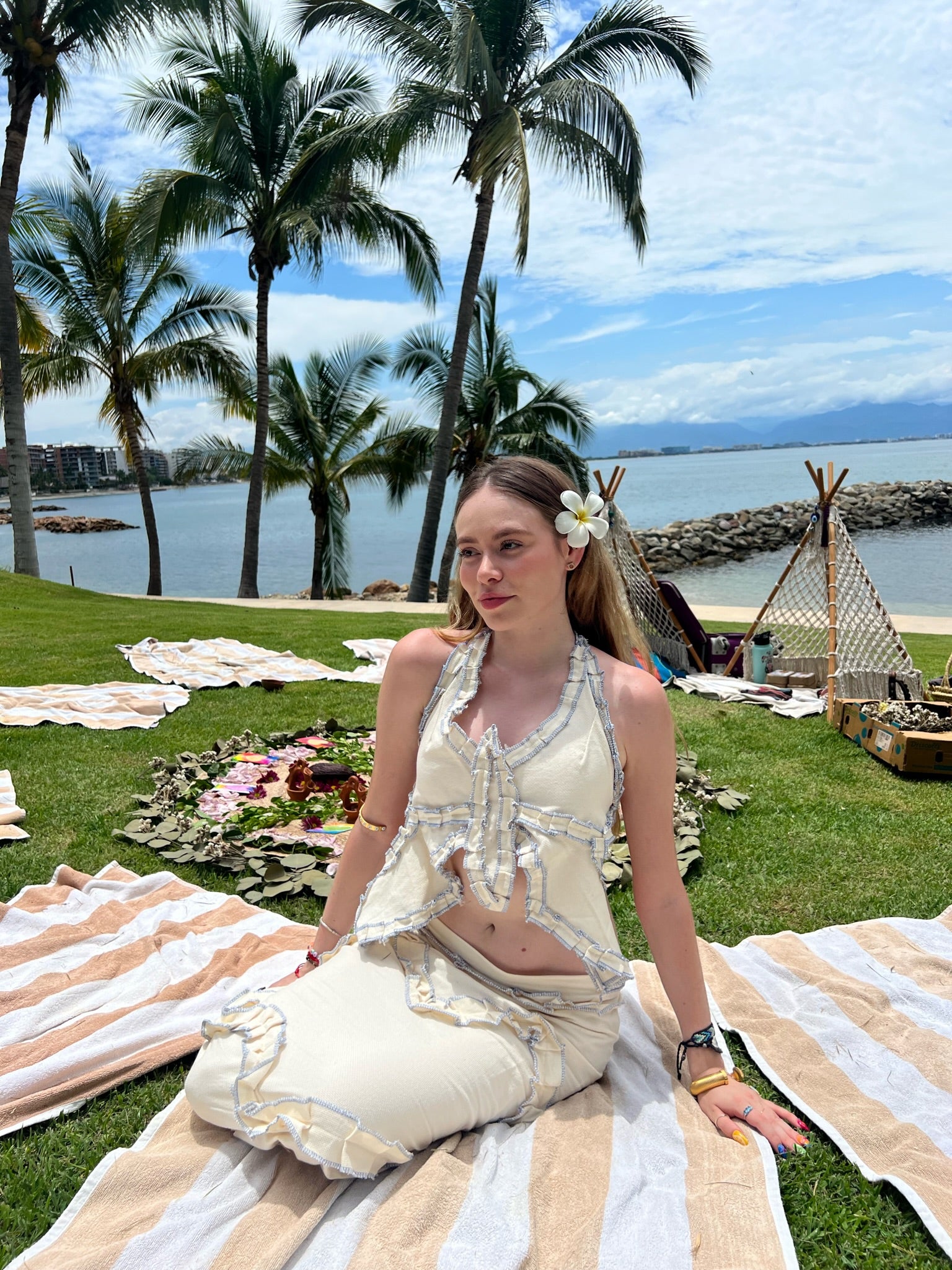 Top estilo mariposa, espalda descubierta con textil de algodón y diseño sobrehilado azul.