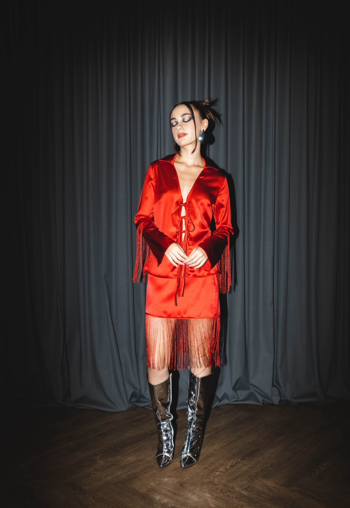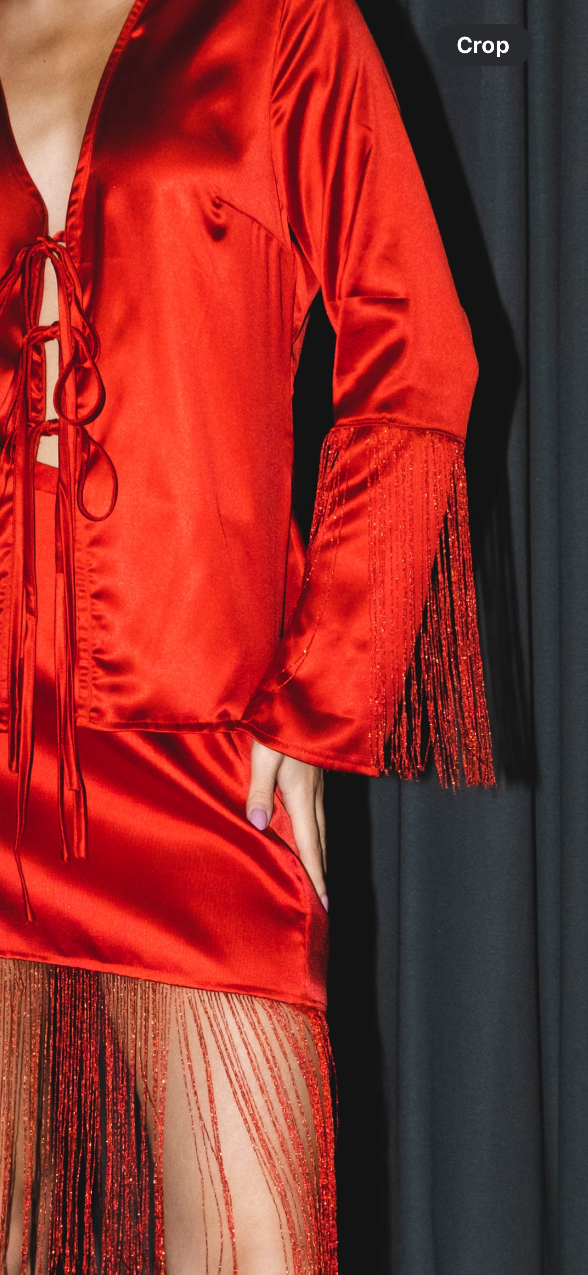 Set de blusa satinada con abertura y cordones al frente y falda rígida con tiras colgantes en ambas piezas.