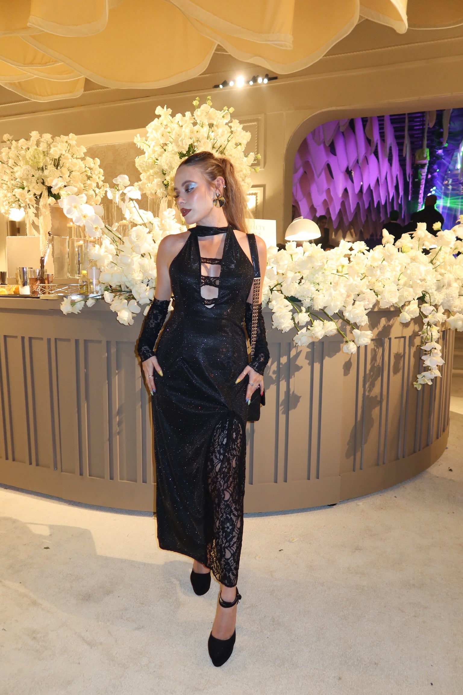 Vestido negro de licra brillante con abertura en pierna izquierda de encaje y con aplicaciones de encaje, accesorios: mangas de encaje y tira larga de licra brillante tipo chocker para el cuello, acomodo al gusto.