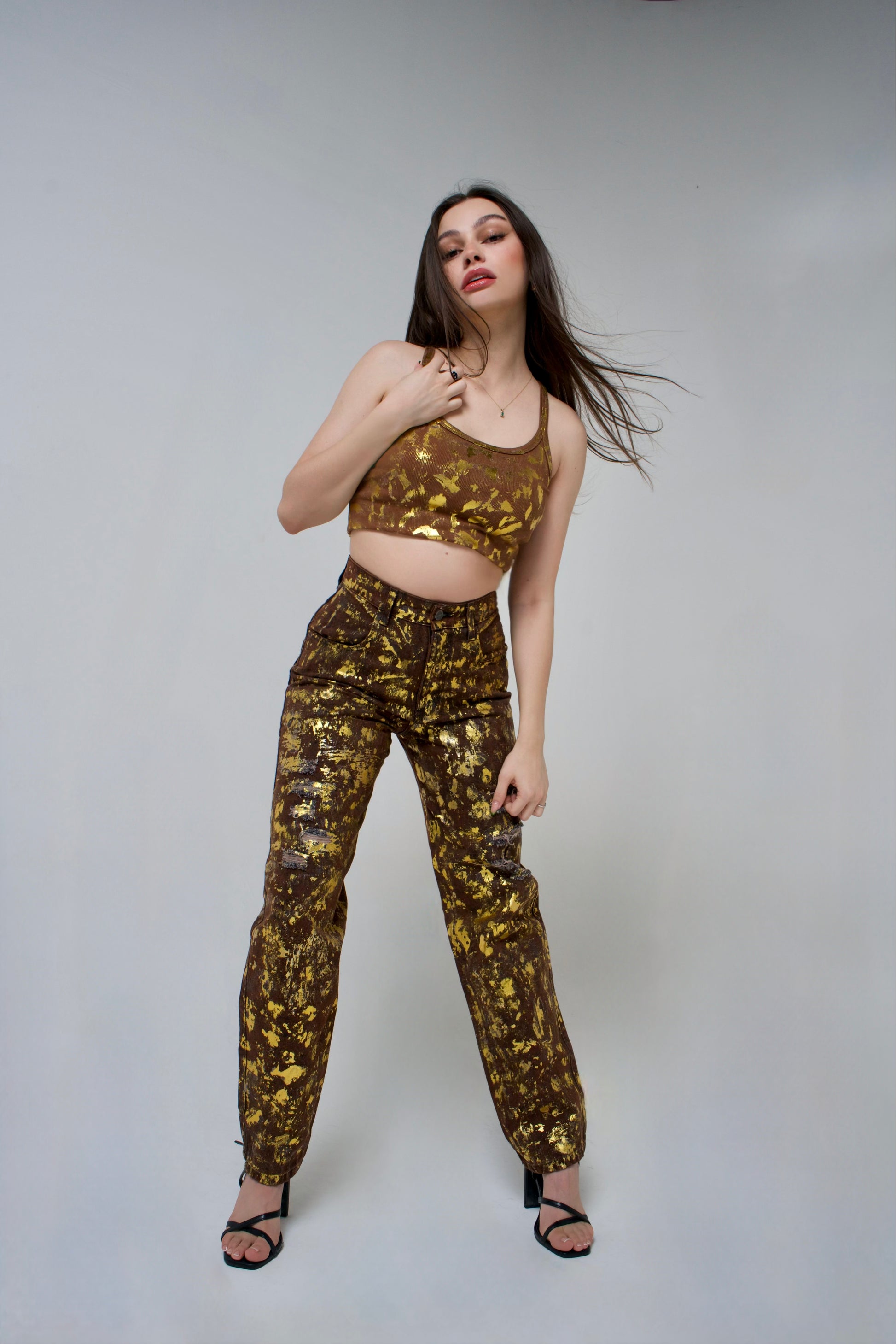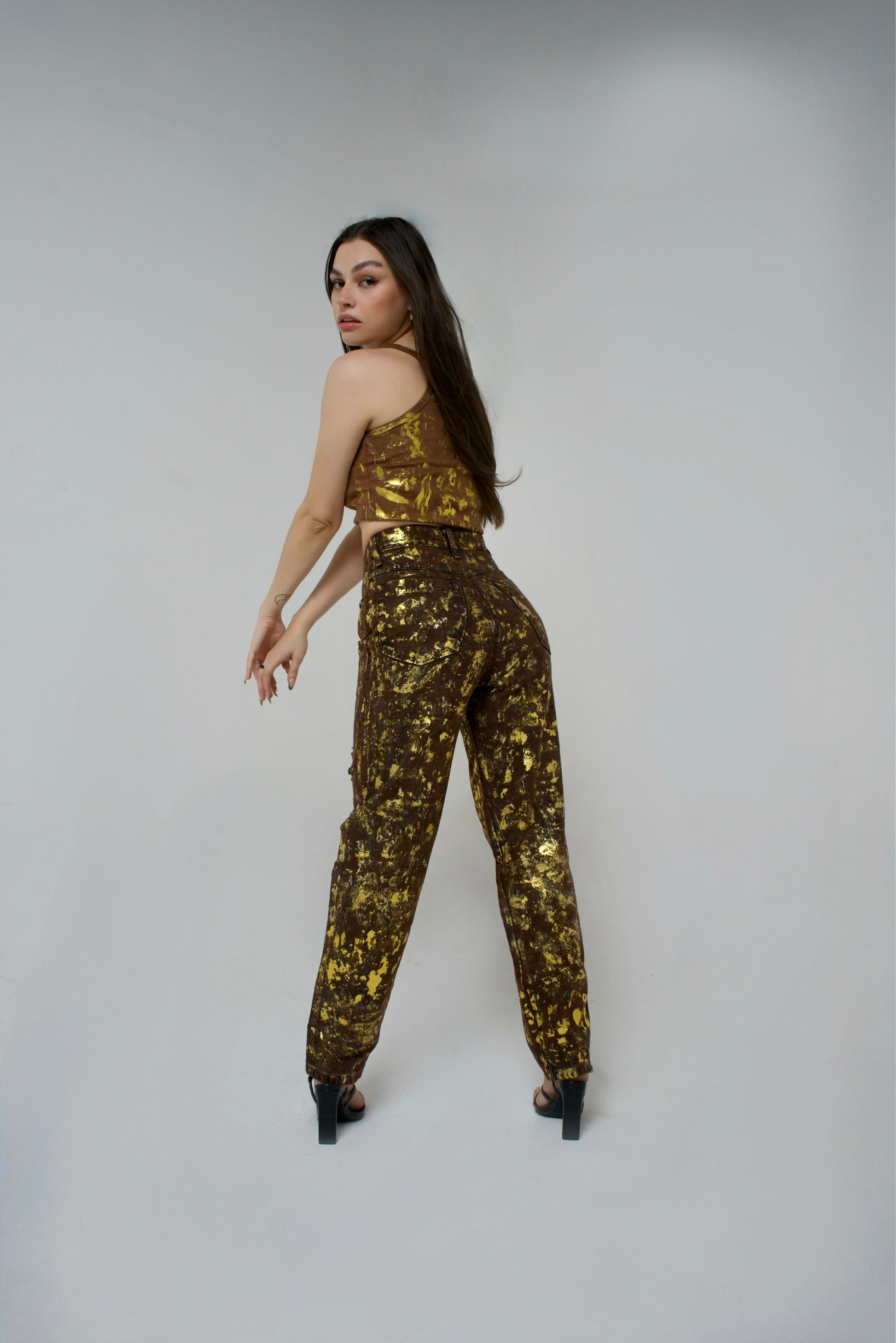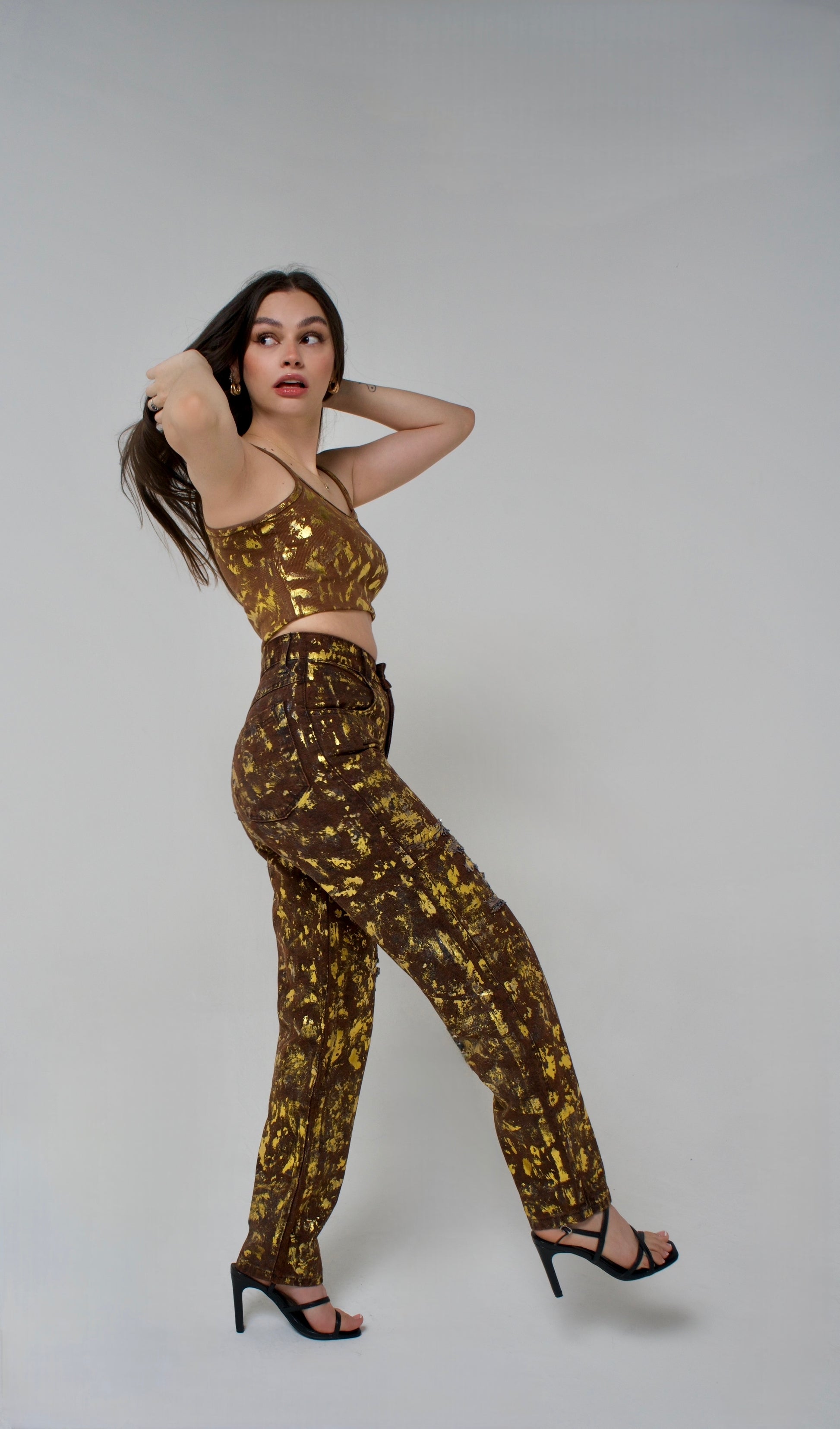 PANTALÓN HIGH WAIST DE MEZCLILLA CAFÉ CON TONOS METÁLICOS DORADOS (EL PATRÓN DE CADA DISEÑO PUEDE VARIAR DE LA FOTO ORIGINAL)