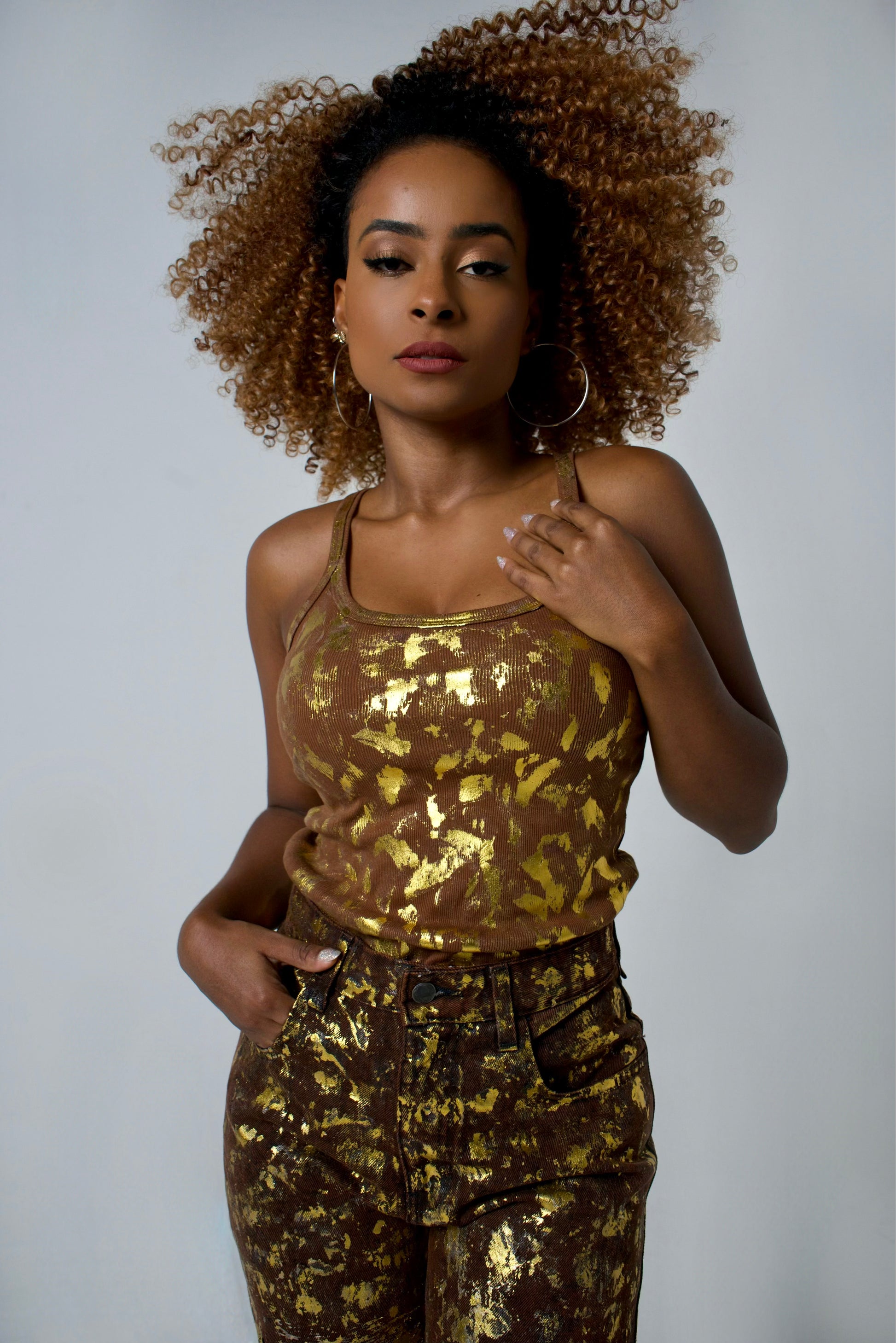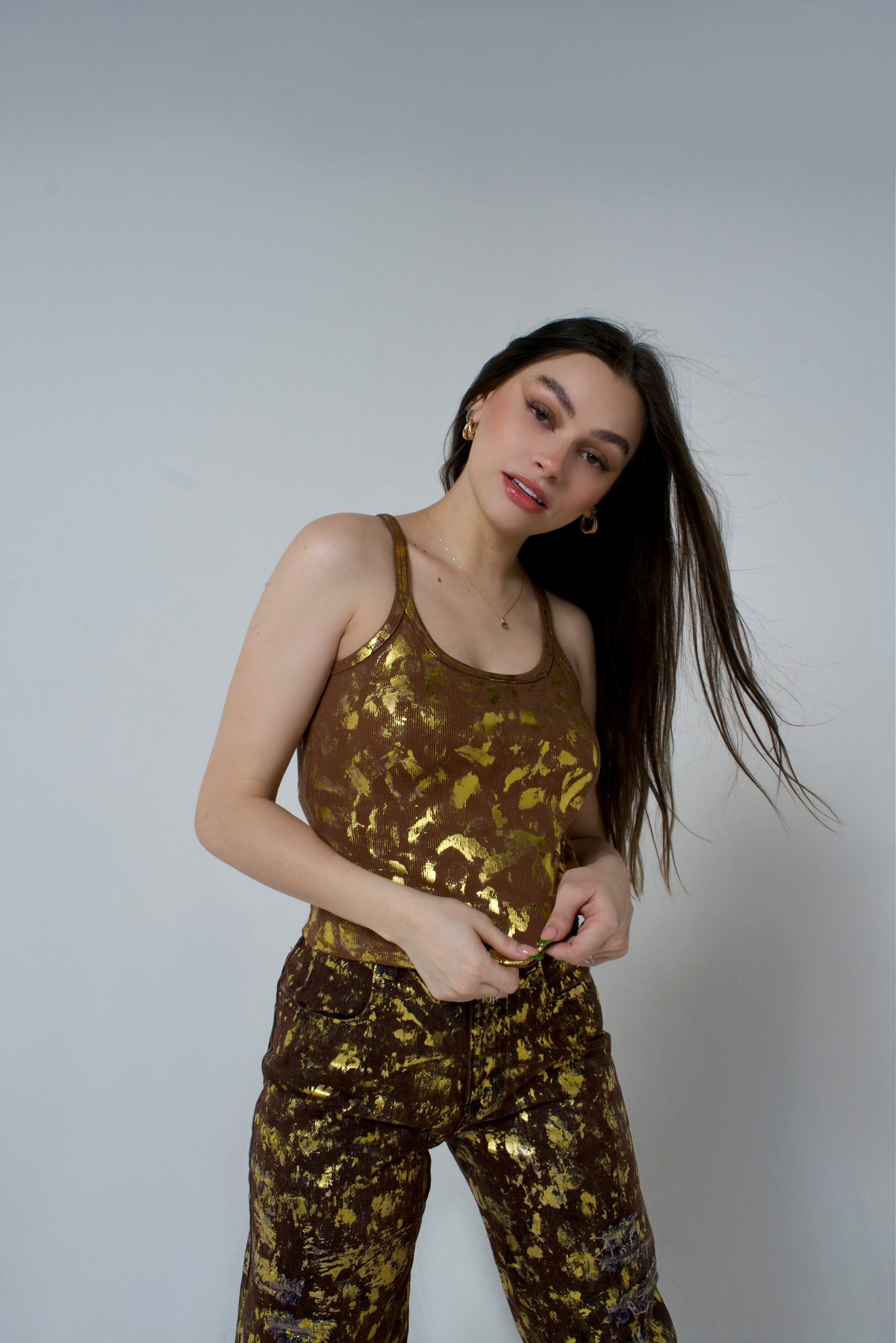 BLUSA CAFÉ A LA CINTURA CON TONOS METÁLICOS DORADOS (EL PATRÓN DE CADA DISEÑO PUEDE VARIAR DE LA FOTO ORIGINAL)