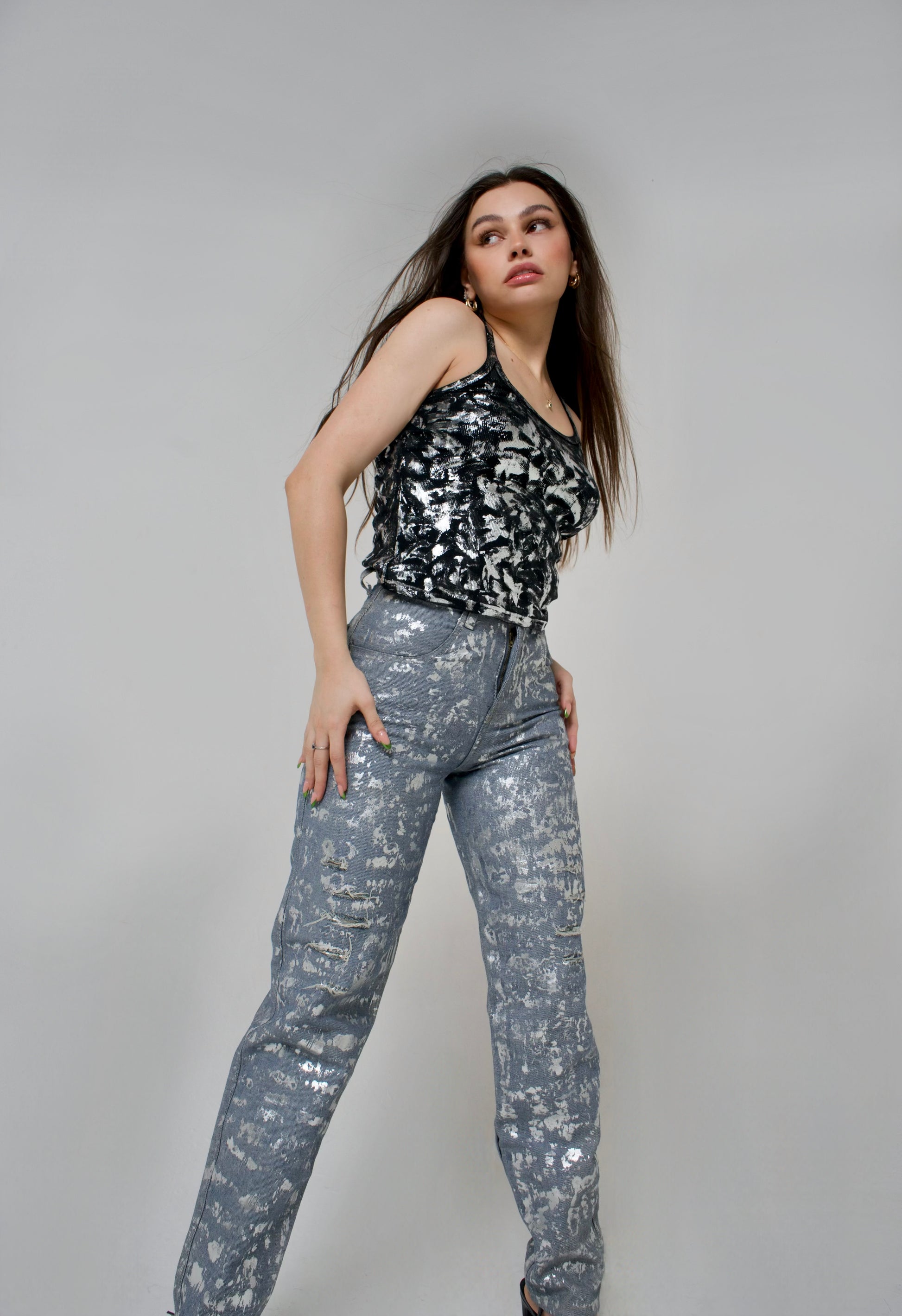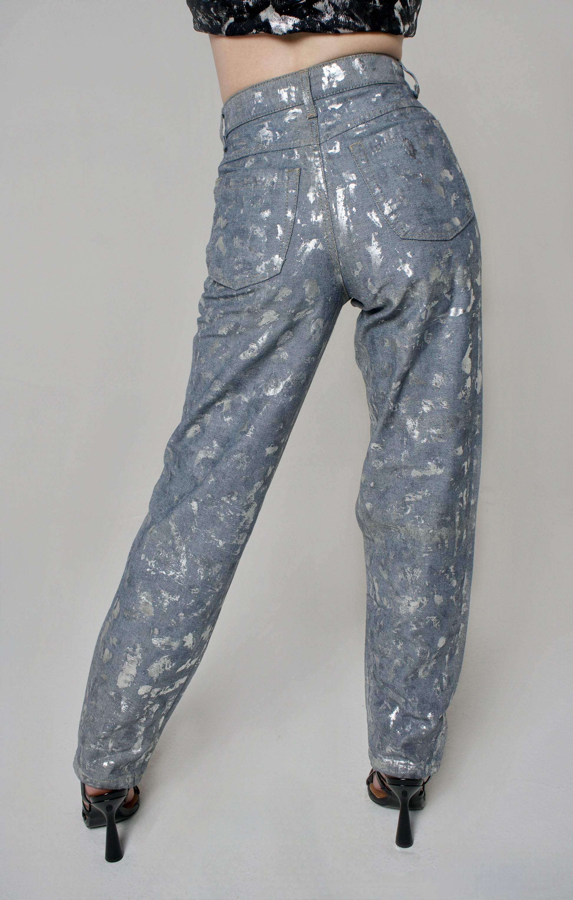 PANTALÓN HIGH WAIST DE MEZCLILLA GRIS CON TONOS METÁLICOS PLATEADOS (EL PATRÓN DE CADA DISEÑO PUEDE VARIAR DE LA FOTO ORIGINAL)