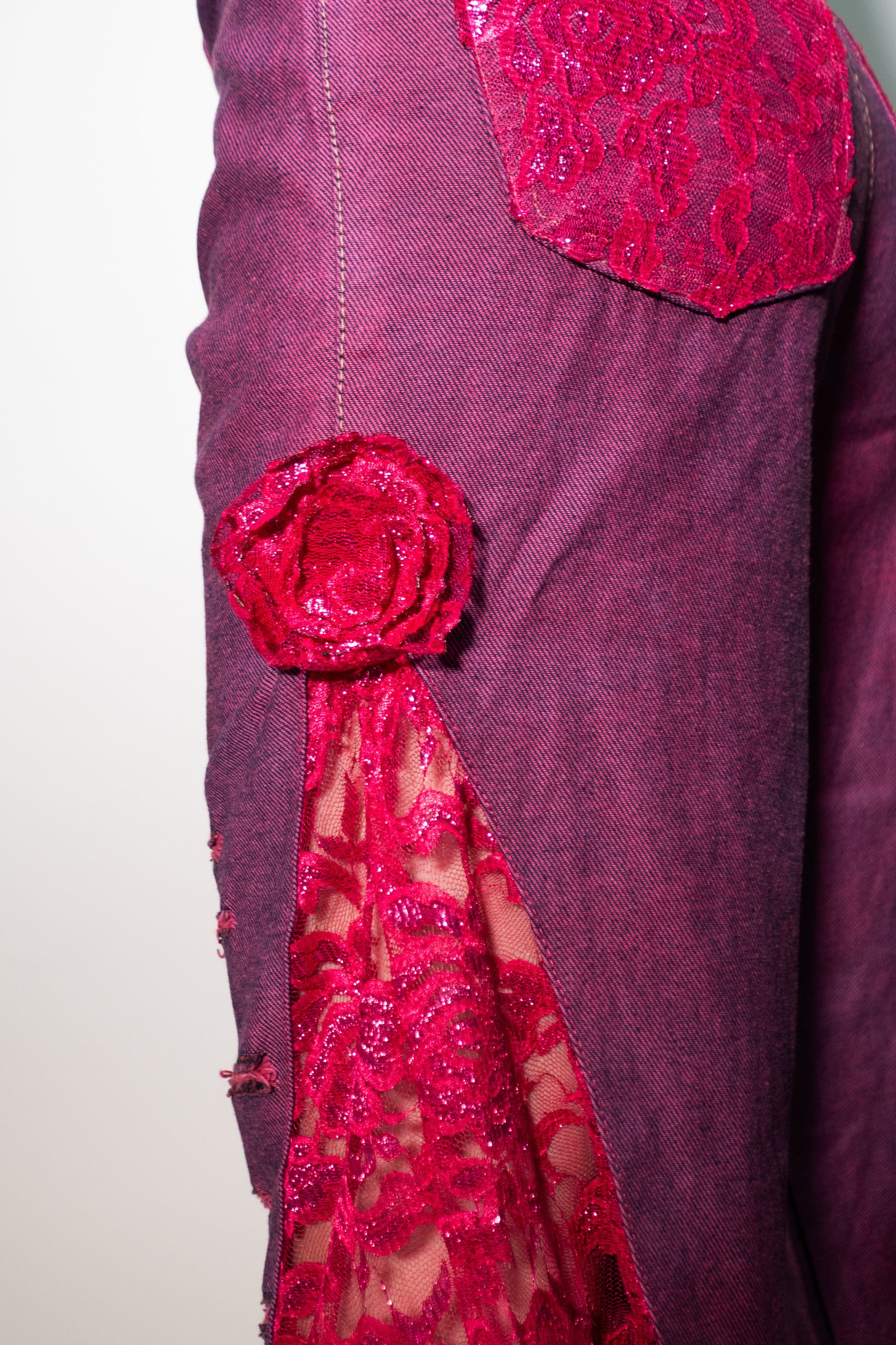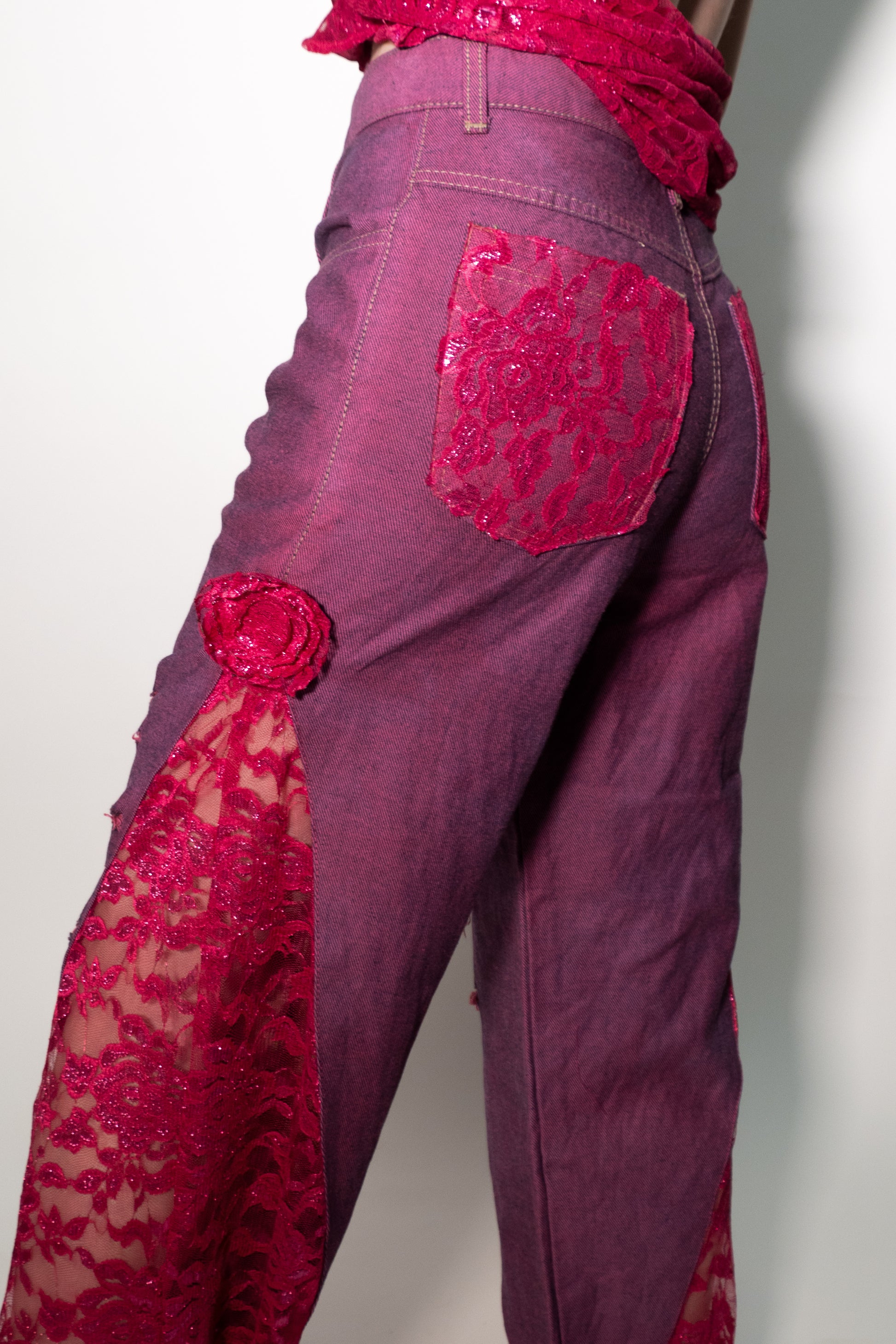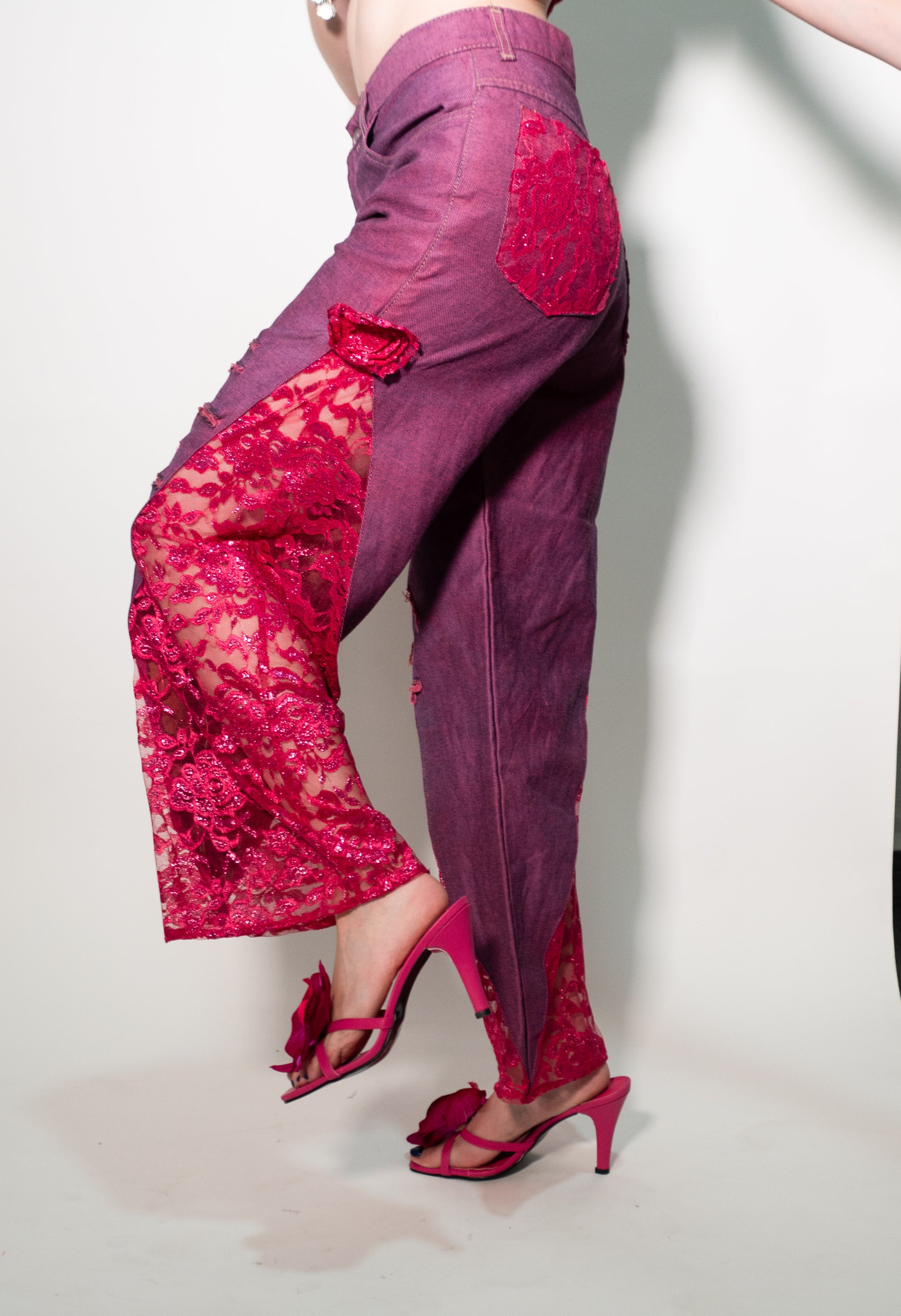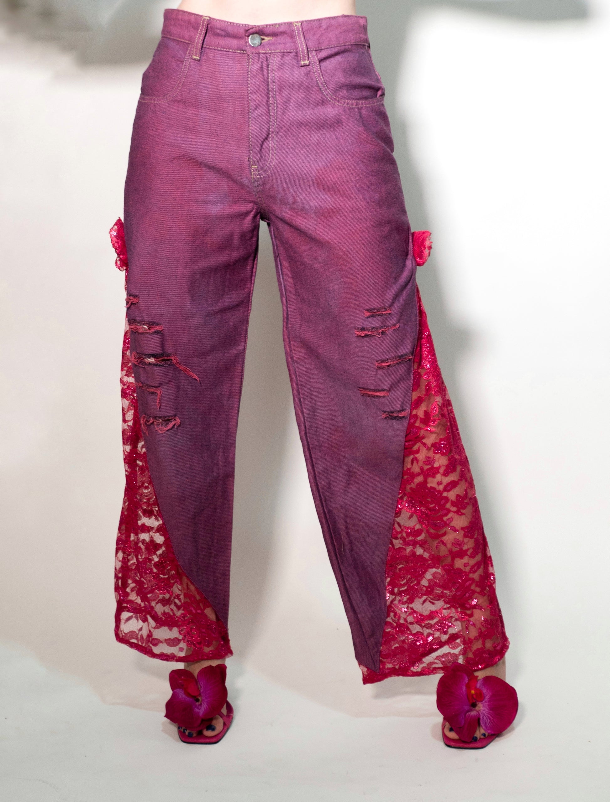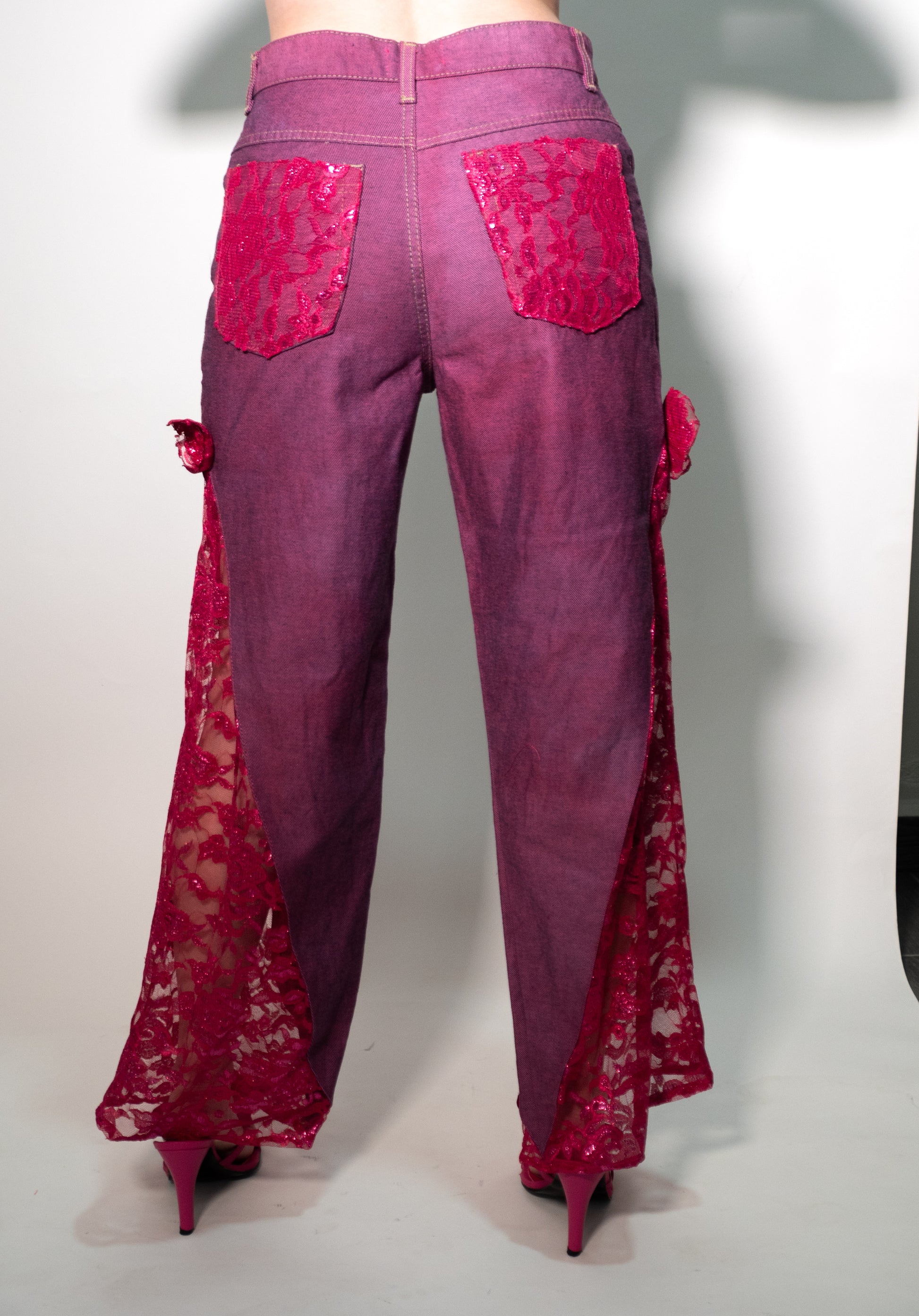 PANTALÓN HIGH WAIST DE MEZCLILLA ROSA CON DETALLES DE ENCAJE ROSA Y APLICACIONES.