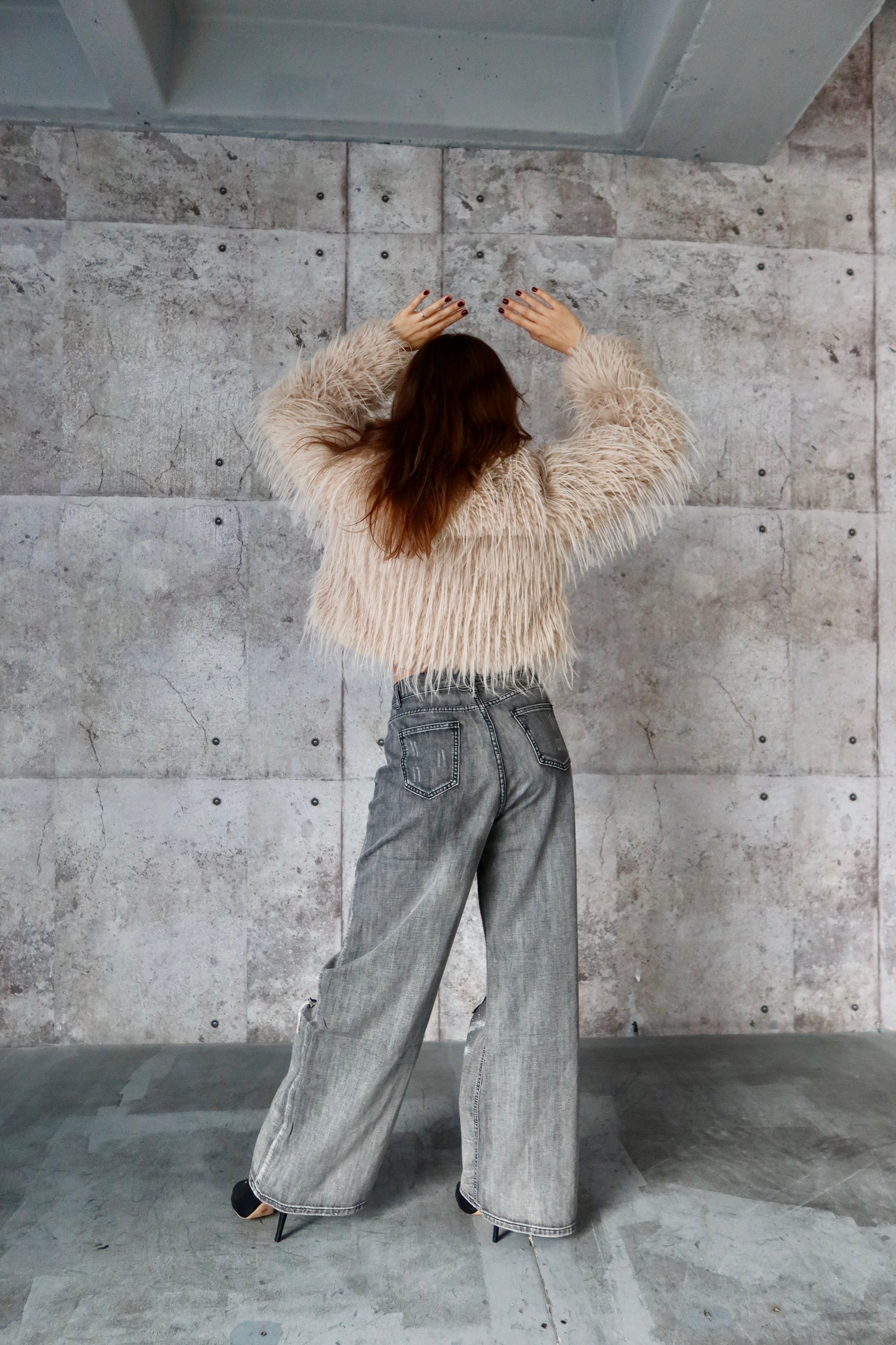 Pantalón de mezclilla suave estilo “flare” color gris con tonos metálicos plateados y roturas específicas.